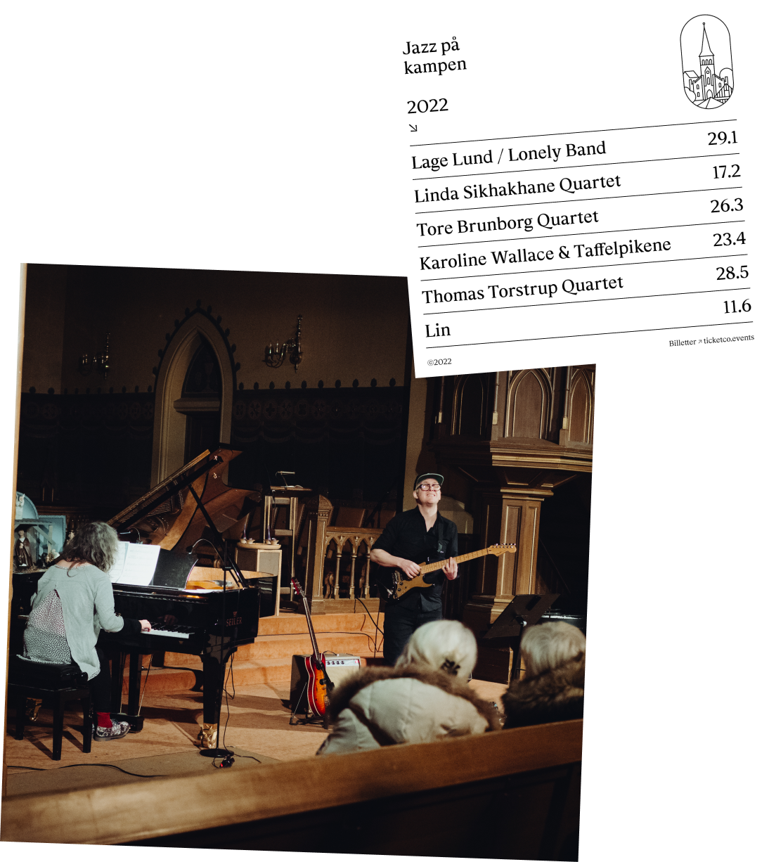 Siden 2019 har vi arrangert Jazz på Kampen i samarbeid med Kampen Kirke. Fordi jazz er kult. Følg oss på Facebook for kommende arrangementer — eller kjøp billetter her.
